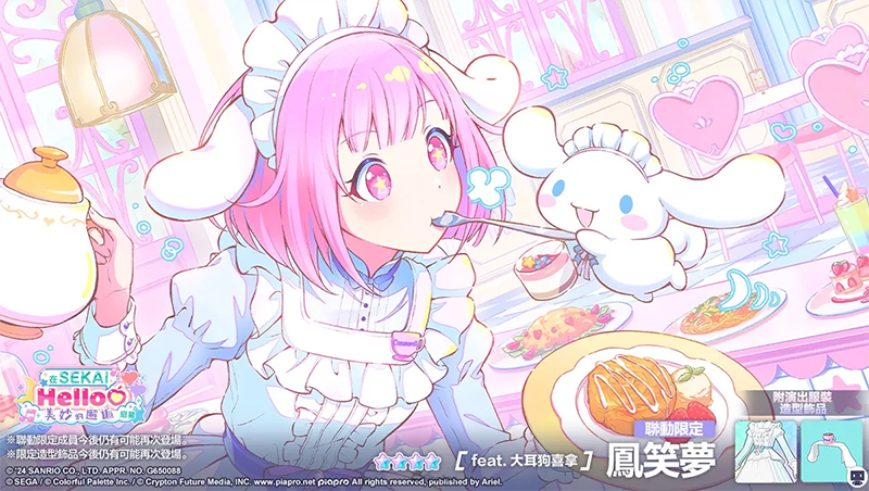 「在『SEKAI』Hello♡美妙的邂逅招募」中会出现「演出服装」和「限定造型饰品」的6位「联动限定★4成员」、以及20位「联动限定★2成员」。 这些新成员与同稀有度的其他成员相比有更高的出现机率。