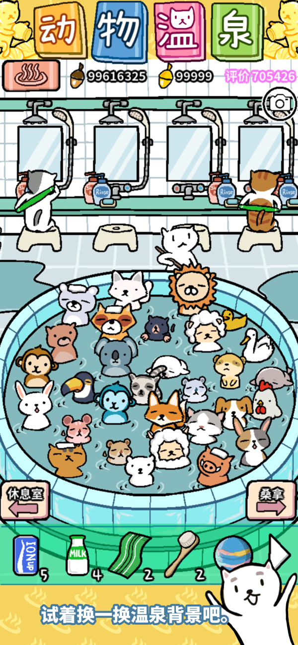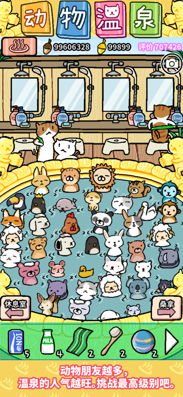 4、温泉的评价越高,能邀请的动物朋友就会越多,请招待所有动物朋友吧!