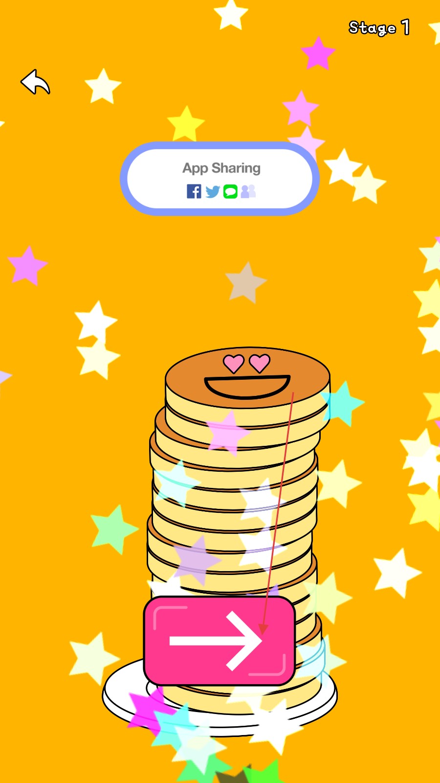4、成功堆叠一定数量的煎饼完成关卡目标后,点击粉色箭头按钮,进入下一关或进入新的游戏环节。