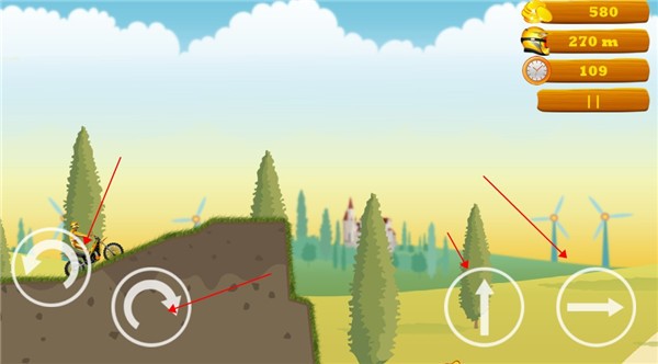 3、左边的按键可控制摩托车翻转,右边按键是跳跃和前进