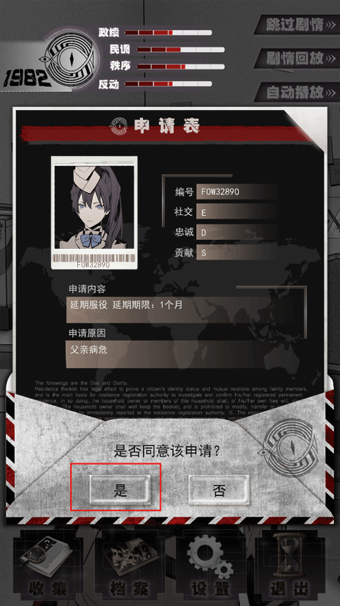 玩家作为调查官,她和的思想和行为,在游戏中她与某人(可能是上级官员)的对话中也可以感受到可能是比较偏激的,每天审核的文件,或许很让玩家为难,但理性的去审核应该就好办了。