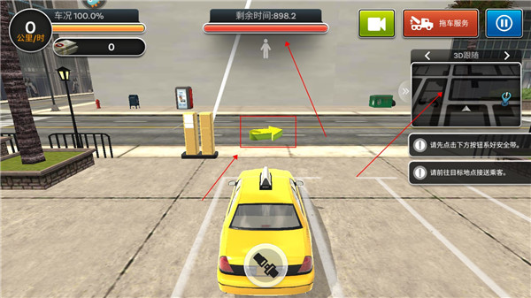 4、开始任务,上方会显示时间限制,你要在时间结束前将顾客送到目的地,右边有小地图可以查看,车辆上方还有箭头指示,不用怕找不到方向哦。