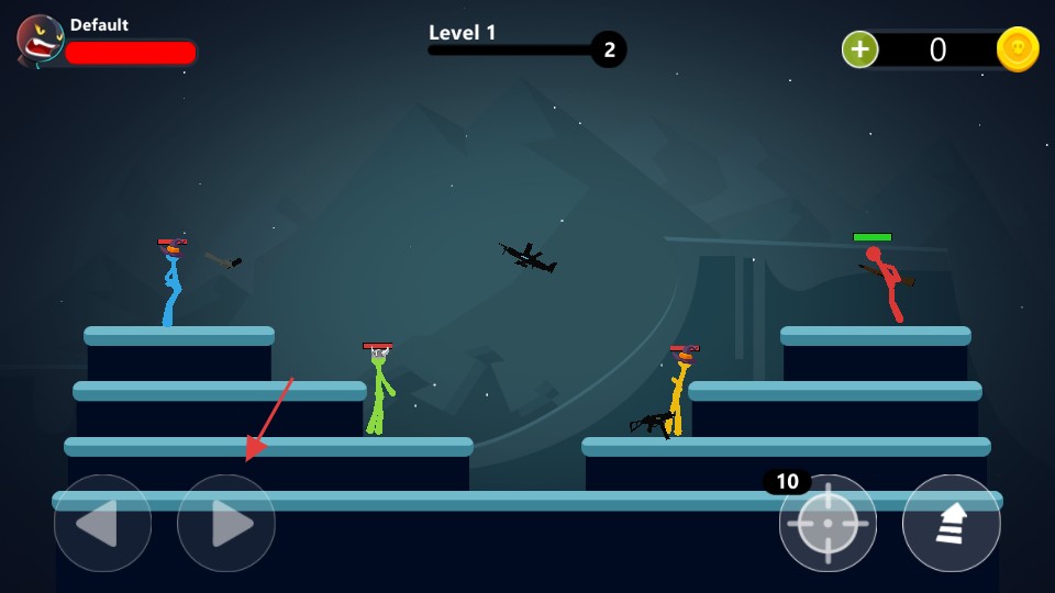1、4名火柴人同时战斗,相互射击,武器会随掉落,包含了狙击枪、喷火器、冲锋枪等多种武器;