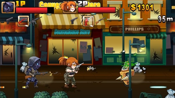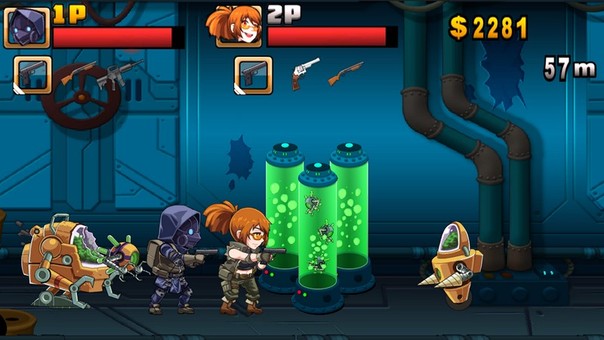 2. 横版射击生存游戏:游戏采用横版射击生存玩法。玩家需要勇敢的战斗来制服“制造麻烦”的机器人。