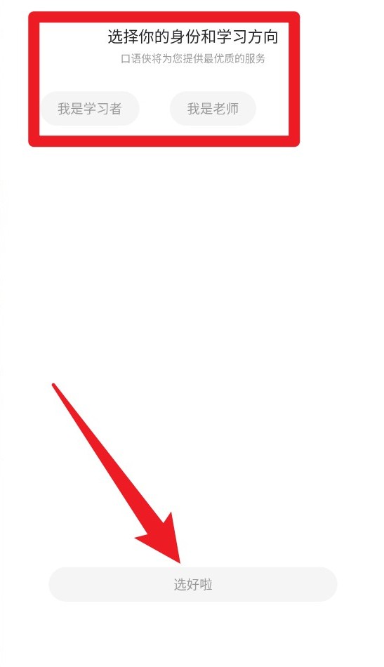 1、首次进入应用时,先选择自己的身份为“学习者”或“老师”,确认后点击下方的“选好啦”按钮进入下一步。