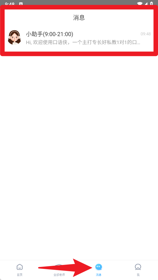 4、在“消息”页面可查看来自平台助手或老师的最新消息通知,及时获取课程安排及活动信息。