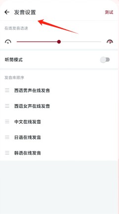 2、点击发音设置页面,能调节在线发音语速,选择西语、中文、日语、韩语等发音库。
