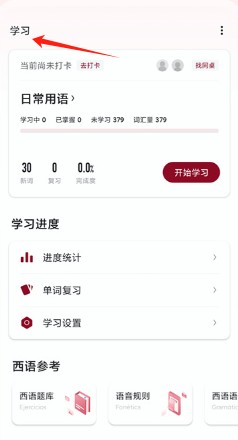 3、点击学习页面,显示日常用语学习进度,有打卡、进度统计、单词复习等学习功能。
