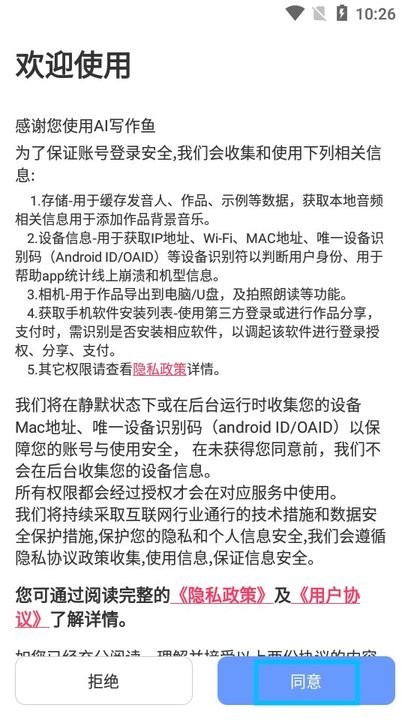 ·在第三下载打开并下载AI写作鱼,阅读弹出的内容,点击【同意】;