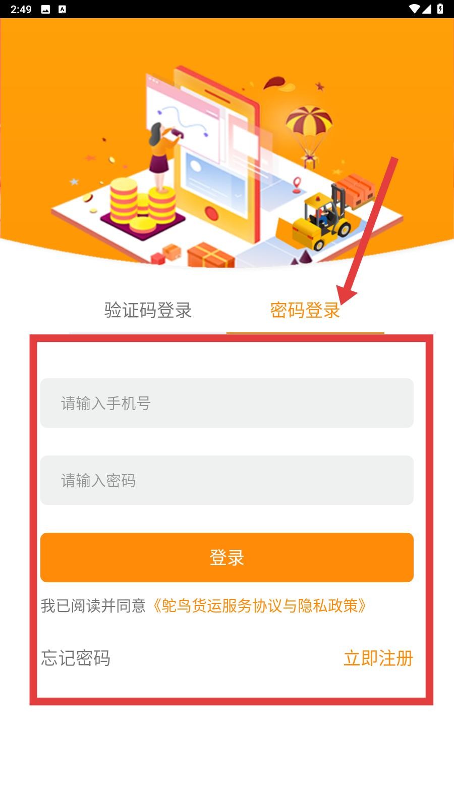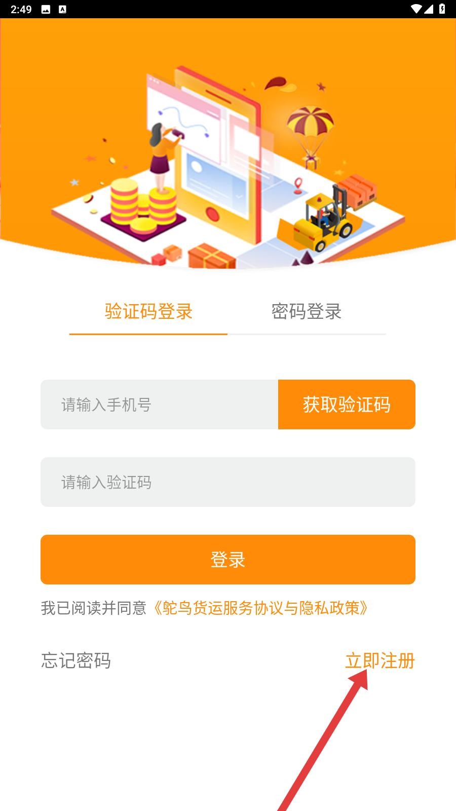 1、开启鸵鸟货运应用,进入初始登录界面,界面呈现验证码登录与密码登录两种选项,先点击立即注册选项,系统将跳转至注册流程页面。
