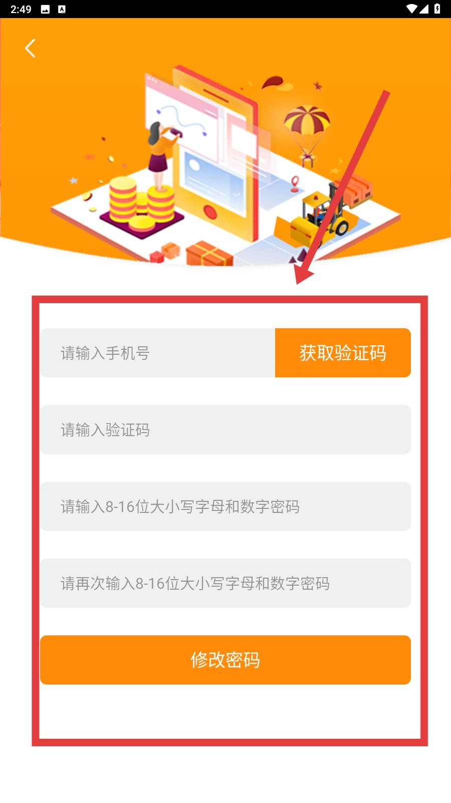2、在注册页面,先输入手机号,点击获取验证码,收到后填入验证码框接着设置密码,再次输入确认,点击修改密码,完成注册步骤。