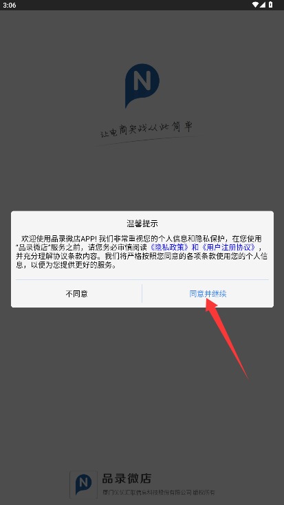 1、打开应用后仔细阅读用户协议和隐私政策,确认后点击同意并继续按钮进入应用。