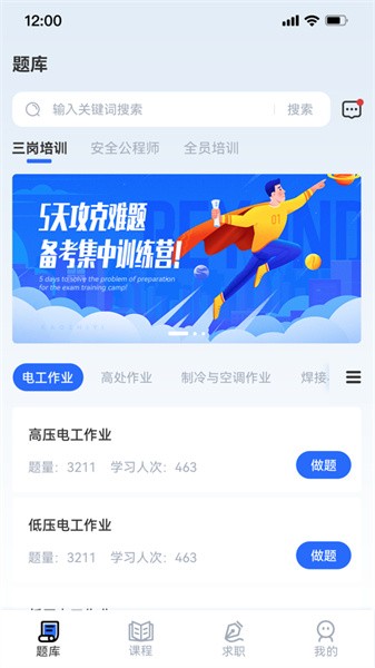 3、内容涵盖特种作业上岗证,职业技能等级,职业资格考前辅导,行业企业等各类专业课程,海量试题,全面助力学员考证上岸。