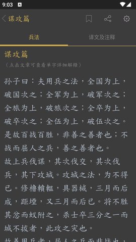 1. 这款“《孙子兵法》”应用程序整合了多种资源的优势,共包含五个部分:原文、注释、译文、知名学者的解读以及解释说明。